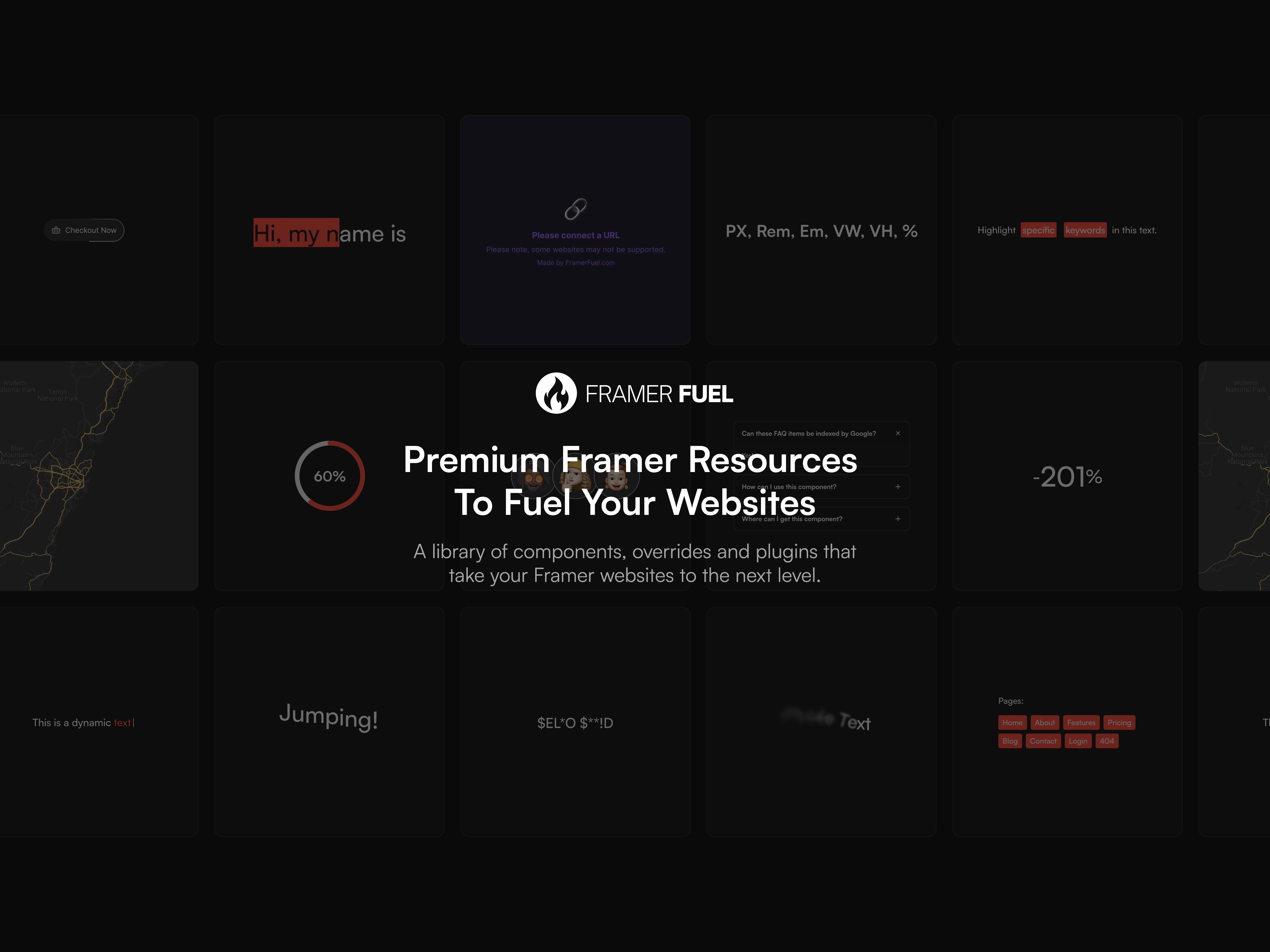 FramerFuel was designed to make the impossible within Framer, possible. We've built a library full of components and overrides that help take your website to the next level.Purchasing this product grants you unlimited & lifetime access to use our resources in all of your projects such as; client work, personal projects and templates.What's included: Premium componentsOverridesAll future updatesLifetime access Do I need coding knowledge? No, all of the resources within FramerFuel are pre-built, you simply edit them like any other component within Framer. Support: Upon purchasing you'll be redirected to the sign-up page, where you enter your license key (which will be emailed to you) and from there you create your account.Further support can be accessed by DM'ing @framerfuel on X (Twitter)